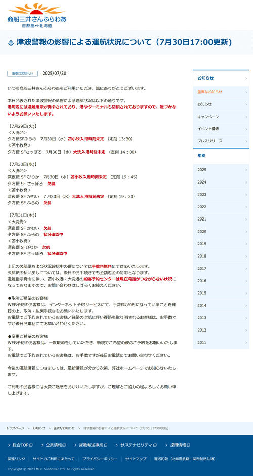 首都圏と北海道などを結ぶ航路を持つフェリーを運航する「商船三井さんふらわあ」の公式サイトは30日、この日午前8時25分ごろ、ロシア・カムチャツカ半島付近を震源として発生した巨大地震の影響で、