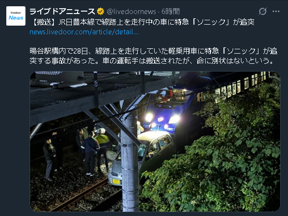 | 【速報】JR日豊本線で特急「ソニック」と車が衝突 遅れや運休が発生 78歳の男性が運転、誤って侵入して線路上を走行 大分 - TBS NEWS DIG 【速報】JR日豊本線で特急「ソニック」と車が衝突 遅れや運休が発生 78歳の男性が運転、誤って侵入して線路上を走行 大分 TBS NEWS DIG (出典:TBS NEWS DIG) |