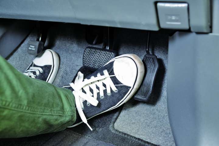 左足でブレーキを踏む