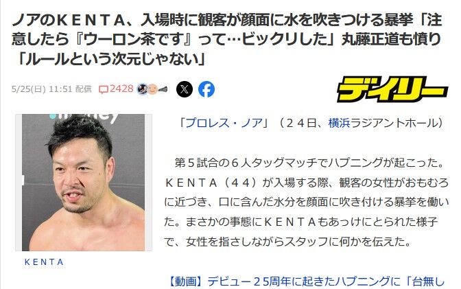 【プロレス】ノアのKENTA、入場時に女性客から口に含んだウーロン茶をぶっかけられ困惑😰