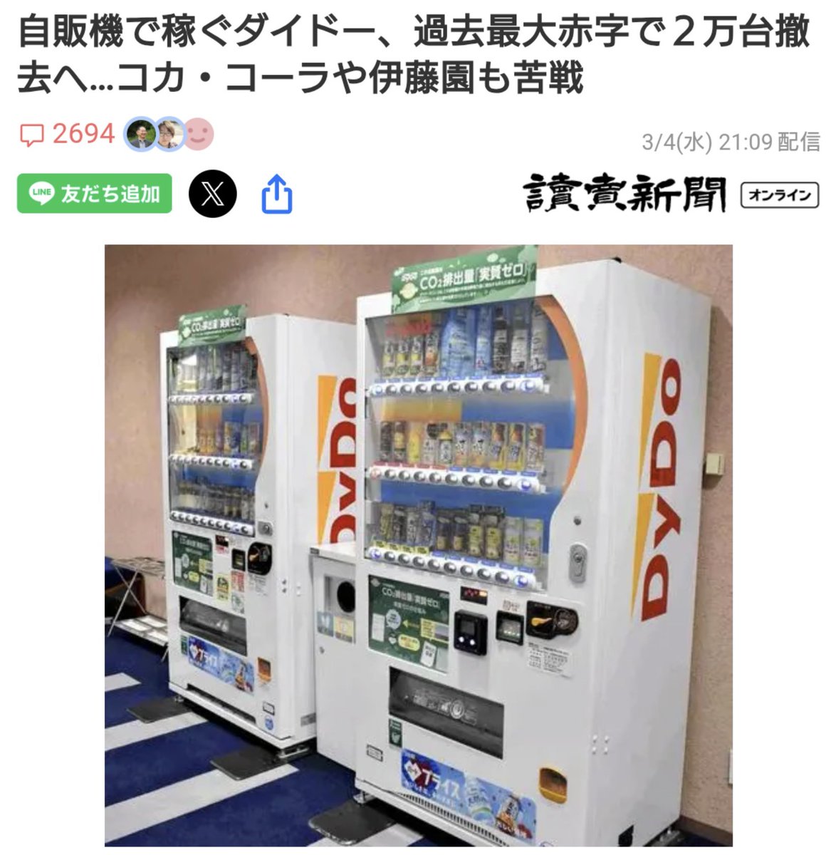 【悲報】ダイドー、過去最大赤字で自販機2万台撤去へ…