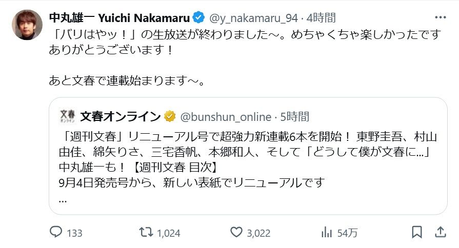 昨夏スキャンダル報道の元KAT-TUN・中丸雄一さんが「週刊文春」執筆陣に加わるミラクル展開!